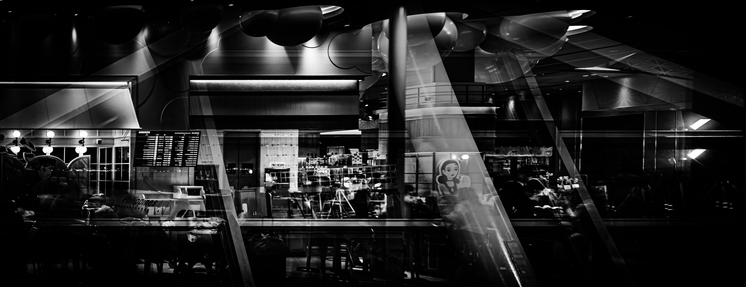 光と影のコントラストは、写真に深みと次元を加えます。明るい部分と暗い部分の相互作用は、視聴者の目を引き、動的な視覚体験を作り出します。この写真では、鋭いコントラストが空港の賑やかな雰囲気と外の静かな夜の対比を強調しています。